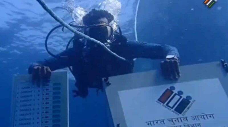 The divers carried a mock Electronic Voting Machine (EVM) as they plunged sixty feet underwater and displayed placards to raise awareness about voting for the upcoming pollsThe divers carried a mock Electronic Voting Machine (EVM) as they plunged sixty feet underwater and displayed placards to raise awareness about voting for the upcoming polls